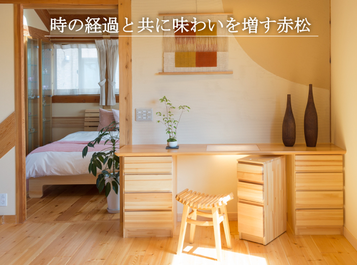 使用する赤松材は、極寒のシベリアで育った樹齢300年の実生の木。厳しい気候環境の中で長い年月をかけて育った木は、目詰りが良く美しい木目が特徴。独自の技術で乾燥・脱脂した材料を用いてますが、わずかに残った松ヤニ成分が独特の光沢となめらかな肌ざわり。そしてその時を経るごとに飴色の味わいに変化します。