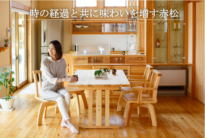 使用する赤松材は、極寒のシベリアで育った樹齢300年の実生の木。厳しい気候環境の中で長い年月をかけて育った木は、目詰まりが良く美しい木目が特徴。独自の技術で乾燥・脱脂した材料を用いていますが、わずかに残った松ヤニ成分が独特の光沢と美しい仕上がり、そして時を経るごとに飴色の味わいに変化します。