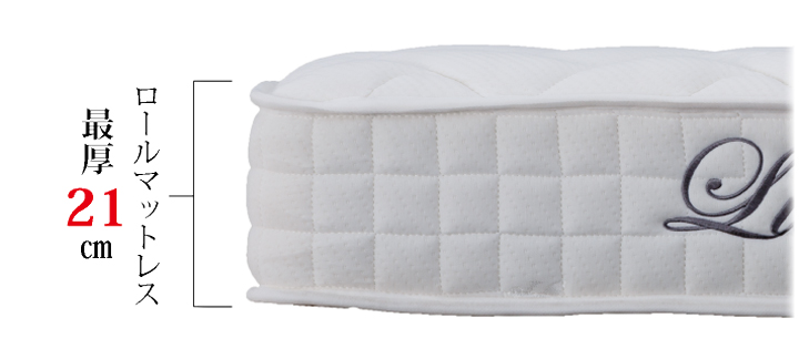 ロールマットレスで20㎝オーバーは業界最高クラス。さらに、全列独立ポケットコイルを使用。線径の大きなコイルを使うことで寝たときの安定感が違います。また、仕上げのキルティング地にも厚手のソフトウレタンを使用することで柔らかさを肌で感じることができます。