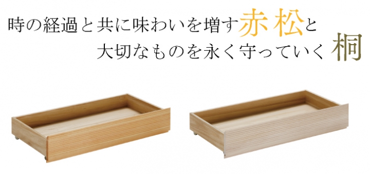使用する赤松材は、極寒のシベリアで育った樹齢300年の実生の木。厳しい気候環境の中で長い年月をかけて育った木は、目詰りが良く美しい木目が特徴。独自の技術で乾燥・脱脂した材料を用いていますが、わずかに残った松ヤニ成分が独特の光沢と美しい仕上がり、そして時を経るごとに飴色の味わいに変化します。そして、桐の引き出しはもちろんのことですが、赤松の引き出しの中身も桐で仕上げています。