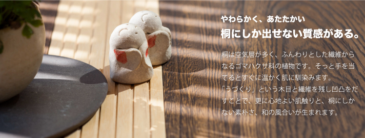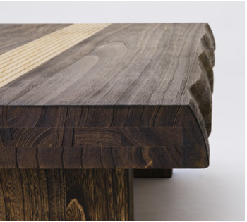 桐の板材を贅沢に使用した三層仕上げの極厚天板。こげ茶色の塗装はオリジナルの「呼吸するワックス」を使用しています。桐のもつ調湿効果と呼吸を妨げずに大人の上質を演出しています。桐は空気層が多いのでがっしりとした作りの天板でも女性一人で移動できる軽やかさも魅力。赤松のウェーブラインがセンターを引き締め、長座卓のすっきりとしたデザイン性を高めています。
