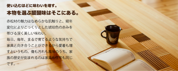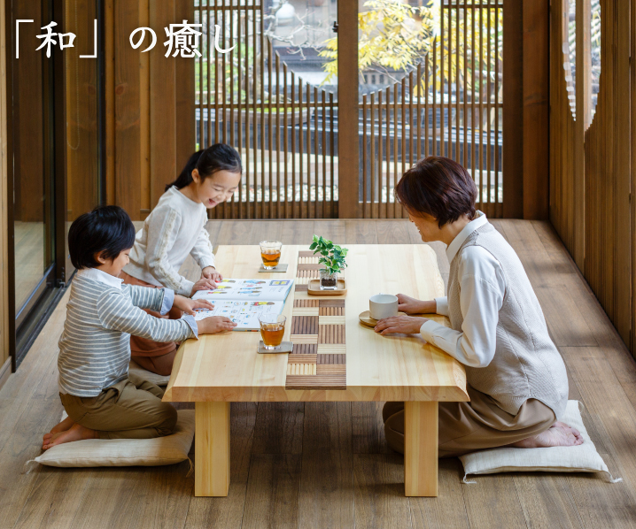 日本人の心に宿る「座」の歴史。畳にお座りしてすごすのが当たり前の家族の団欒風景だったのは、そう遠い昔のことではありません。高級ソファにもこだわりのダイニングセットにも作ることのできない懐かしくて心地よい時間を1台の座卓がうみだしてくれます。和室や客間にかぎらず、リビングの一角にお座りのスペースを儲けることで、大人も子どもも同じ目線ですごすことができるのです。