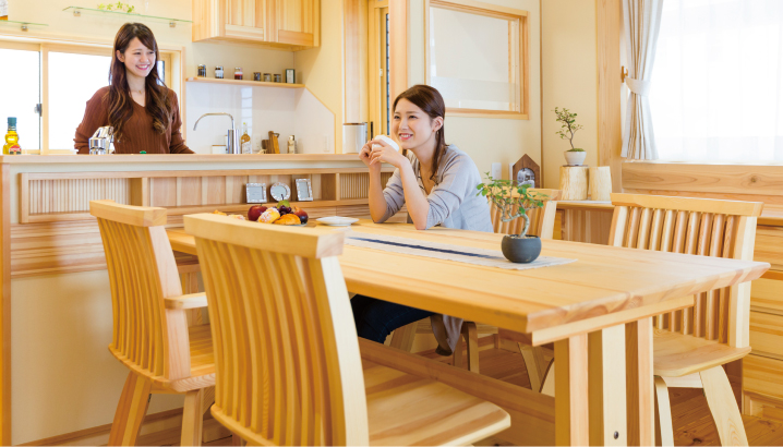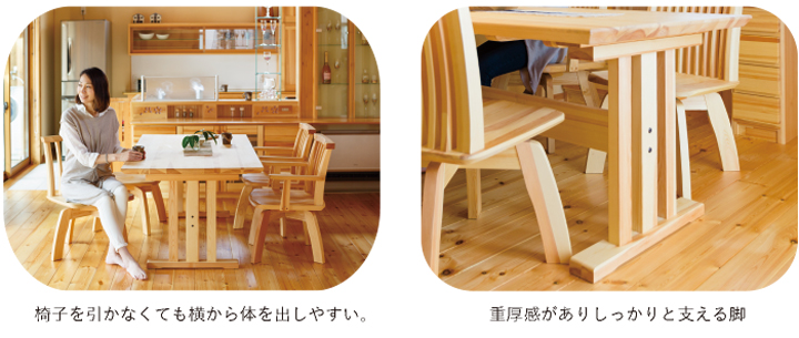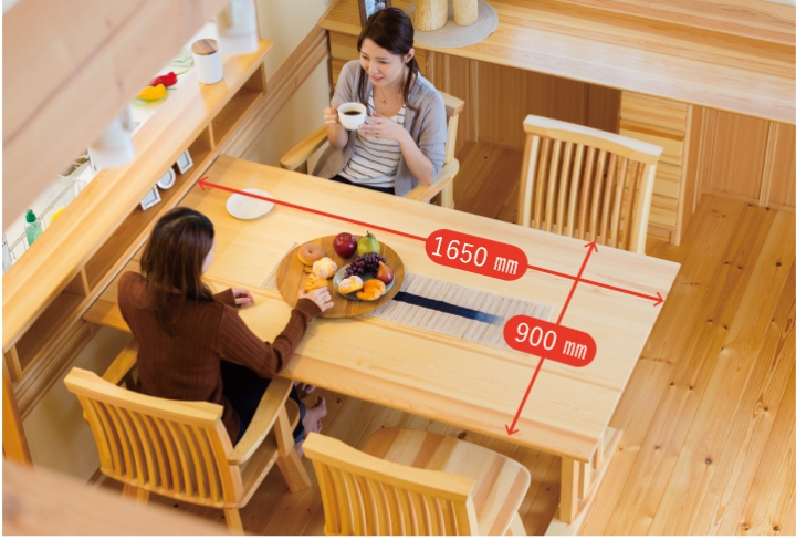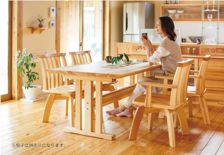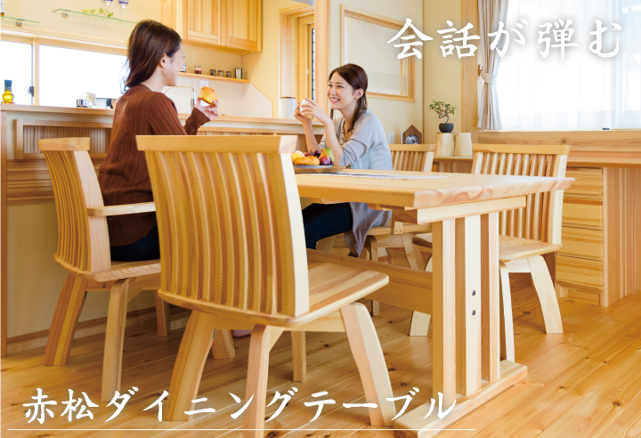 朝は家族の健康を願い、夜は一日の出来事を分かち合う。食卓は家族の幸せを確認する大切な場所です。だからこそ家具は良質でありたい。赤松ならではの木の質感が家族団らんに優しくて温かいぬくもりを与えてくれます。