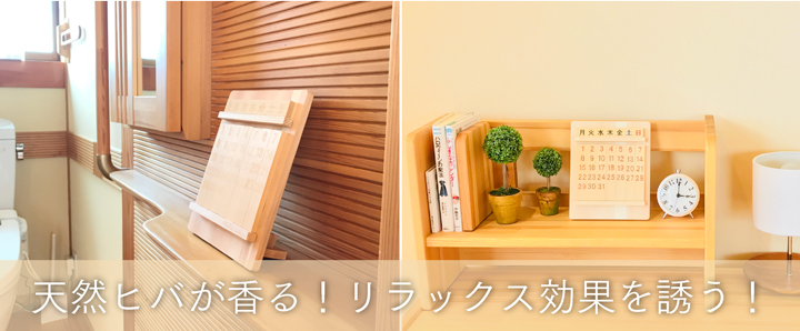 天然ヒバ材に含まれる”ヒノキチオール”には抗菌効果があり、消臭・脱臭効果に優れています。また、ヒバの香りは精神安定効果があり、置いておくだけでリラックス効果が期待できます。