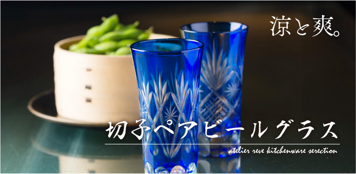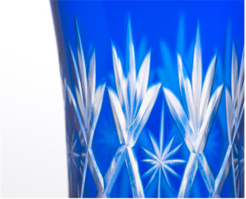 切子は、江戸時代後期に下町のビードロ職人が生みだしたのが起源とされています。以来、職人たちの手によって受け継がれてきた技法や精密な柄の組み合わせ、涼やかな輝きを放つ美しさが最大の魅力です。「色被せ(いろきせ)」というガラスの表面に藍色のガラスを薄くかぶせてから、一つ一つ手作業でカットワークを施していく技法で仕上げた、懐かしさと美しさが共存する和の美の世界をお楽しみいただけます。
