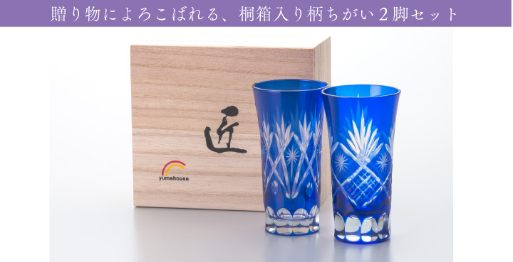 切子は、江戸時代後期に下町のビードロ職人が生みだしたのが起源とされています。以来、職人たちの手によって受け継がれてきた技法や精密な柄の組み合わせ、涼やかな輝きを放つ美しさが最大の魅力です。「色被せ(いろきせ)」というガラスの表面に藍色のガラスを薄くかぶせてから、一つ一つ手作業でカットワークを施していく技法で仕上げた、懐かしさと美しさが共存する和の美の世界をお楽しみいただけます。